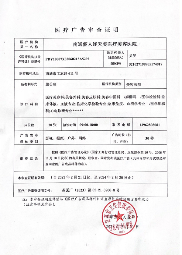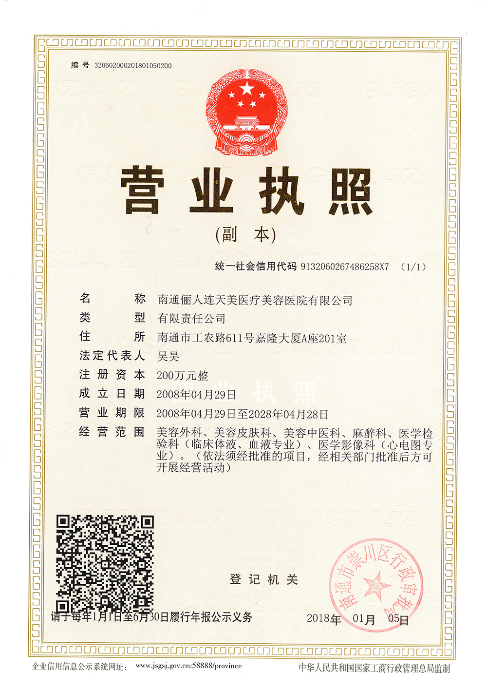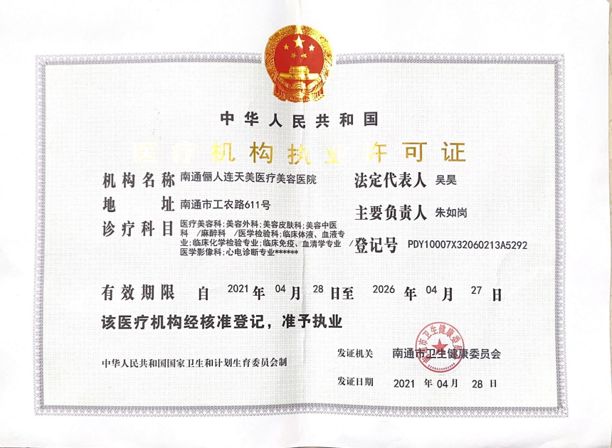 南通儷人連天美醫(yī)療美容醫(yī)院是與著名的醫(yī)療美容集團(tuán)合作建立的醫(yī)院,醫(yī)院提供高品質(zhì)的醫(yī)療美容服務(wù)。2008年,南通儷人連天美醫(yī)療美容醫(yī)院落戶南通,成為由南通衛(wèi)生局審批的專業(yè)醫(yī)療美容醫(yī)院。南通儷人連天美醫(yī)療美容醫(yī)院,特別設(shè)有專業(yè)的整形美容科、皮膚美容科和微創(chuàng)美容科三大科室,致力于為廣大求美者提供全方位的醫(yī)療美容服務(wù)。南通儷人連天美醫(yī)療美容醫(yī)院為求美者建立個(gè)人終生美麗檔案,一對(duì)一進(jìn)行細(xì)致服務(wù)。 11年來,南通儷人連天美醫(yī)療美容醫(yī)院,不斷引進(jìn)先進(jìn)設(shè)備,不斷完善醫(yī)美技術(shù),一批優(yōu)秀、專業(yè)而穩(wěn)定的醫(yī)生團(tuán)隊(duì),為無數(shù)求美者鑄就美麗夢(mèng)想。